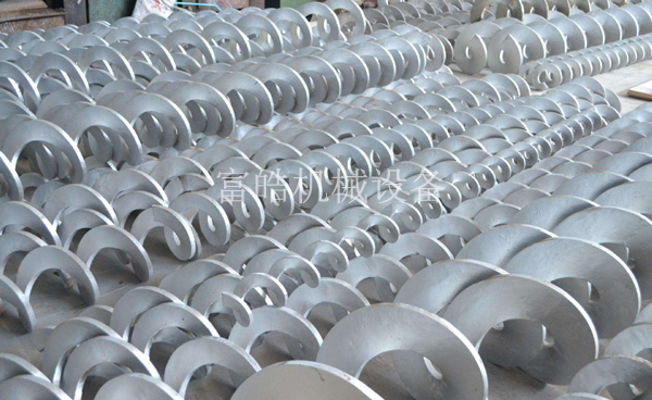 無軸螺旋輸送機:螺旋體為較厚的帶狀螺旋,無軸螺旋,頭部與驅(qū)動軸相聯(lián)。結(jié)構(gòu)上分單、雙葉片兩種,材質(zhì)上分碳鋼、不銹鋼兩類,安螺距比有1:1和2:3兩種。